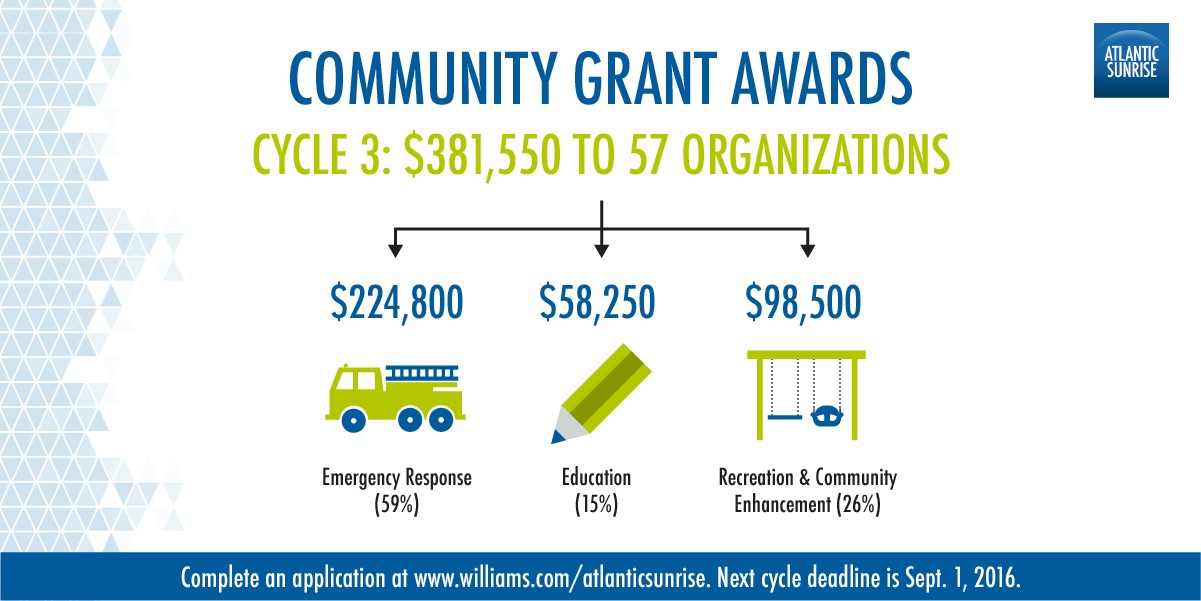 Grants up to $10,000 per applicant are being awarded by Williams to eligible organizations in communities where the proposed Atlantic Sunrise pipeline project would be constructed and operated.
