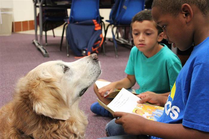 Bretagne_ReadingAfter retiring from search-and-rescue work a few years ago, Bretagne’s service continued as more of a therapy dog. She spent one day a week working with first graders at Roberts Road Elementary School in Hockley, Texas. The students had difficulty reading aloud to classmates, so Bretagne helped them by listening attentively as they read aloud to her instead.