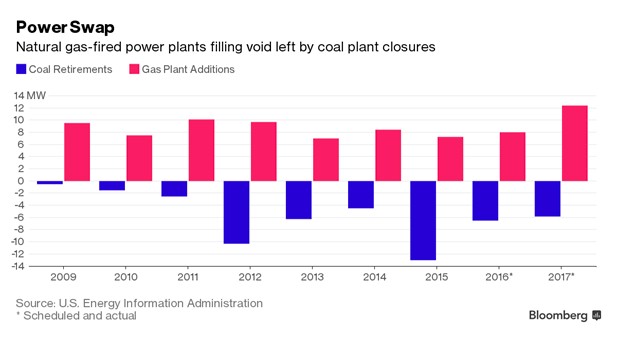 The driving force behind the flood of coal closures has been the U.S. Environmental Protection Agency’s pollution rule. Natural gas emits about half as much carbon dioxide as coal when generating power. As a result of the rise in the popularity of gas, U.S. carbon emission levels have plummeted to 20-year lows.