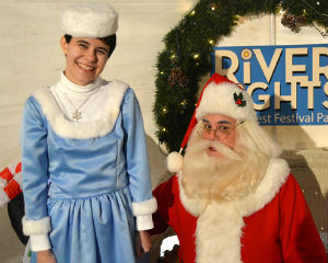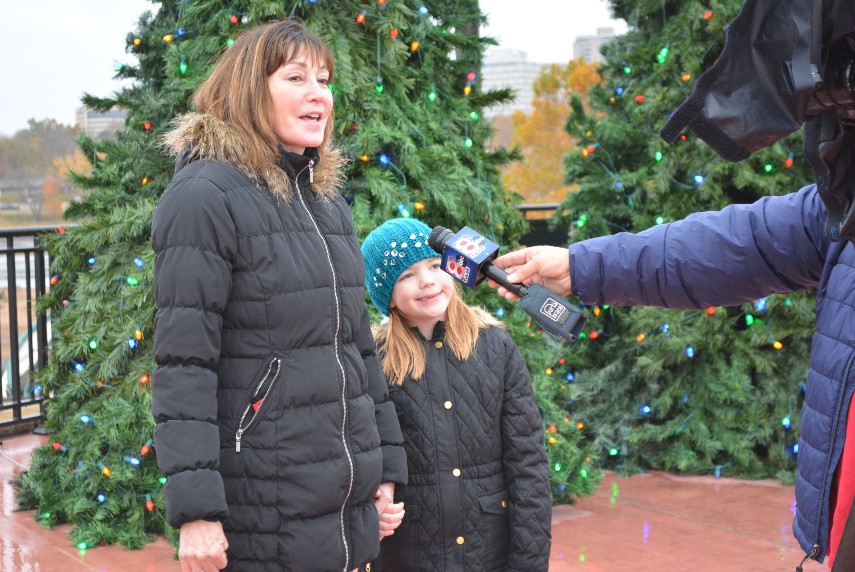 Tall, lighted Christmas trees framed Tulsa’s downtown skyline as Santa and his helper greeted event visitors.