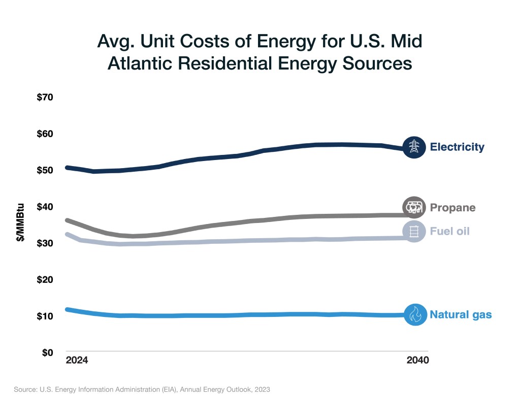 Bottom line: Natural gas is one of the most affordable forms of energy available to residential consumers and for businesses. In the Mid-Atlantic, it’s four times less expensive than electricity and key to keeping us warm this winter, while being a lower source of emissions than heating oil or coal.