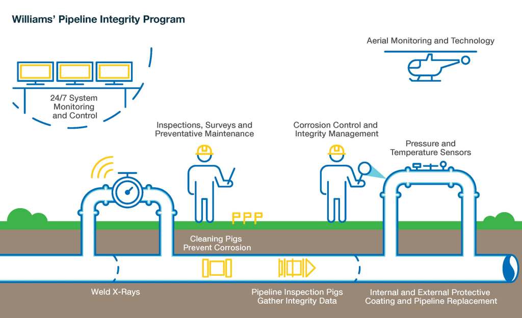 Some Williams pipelines are inspected with robotic inspection crawlers, which self-propel from one end of a segment and back through the same entry point. Guided by an operator outside the line, the articulated crawlers can pass through small-radius bends or tees that bulkier pigs cannot, sending live videos instantaneously.
