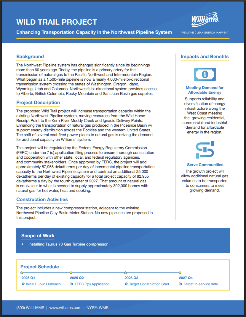The proposed Wild Trail project will increase transportation capacity within the existing Northwest Pipeline system, moving resources from the Wild Horse Receipt Point to the Kern River Muddy Creek and Ignacio Delivery Points. Enhancing the transportation of natural gas produced in the Piceance Basin will support energy distribution across the Rockies and the western United States. The shift of several coal-fired power plants to natural gas is driving the demand for additional capacity on Williams’ system.